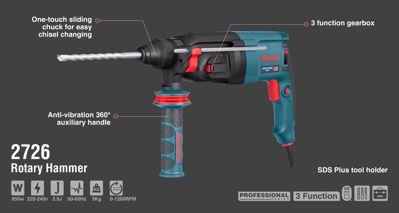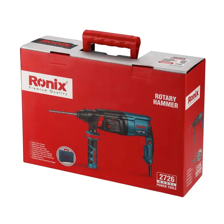دریل بتن‌کن 2726 رونیکس، مجهز به موتور قدرتمند 850 وات، گیربکس صنعتی مقاوم و باکیفیت و بدنه‌ای با طراحی ارگونومیک، سبک‌وزن و مستحکم است. هم‌چنین، سیستم ابزارگیر آن از نوع SDS-PLUS یا چهارشیار انتخاب شده است که می‌تواند مته‌هایی با قطر 26 میلی‌متر را ثابت نگه دارد و موجب افزایش تاثیر عملکرد این محصول شود.